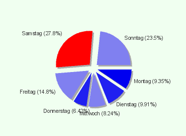 9658 Funde am Wochenende (51,2%) : 9186 Funde an Wochentagen (48,8%) |